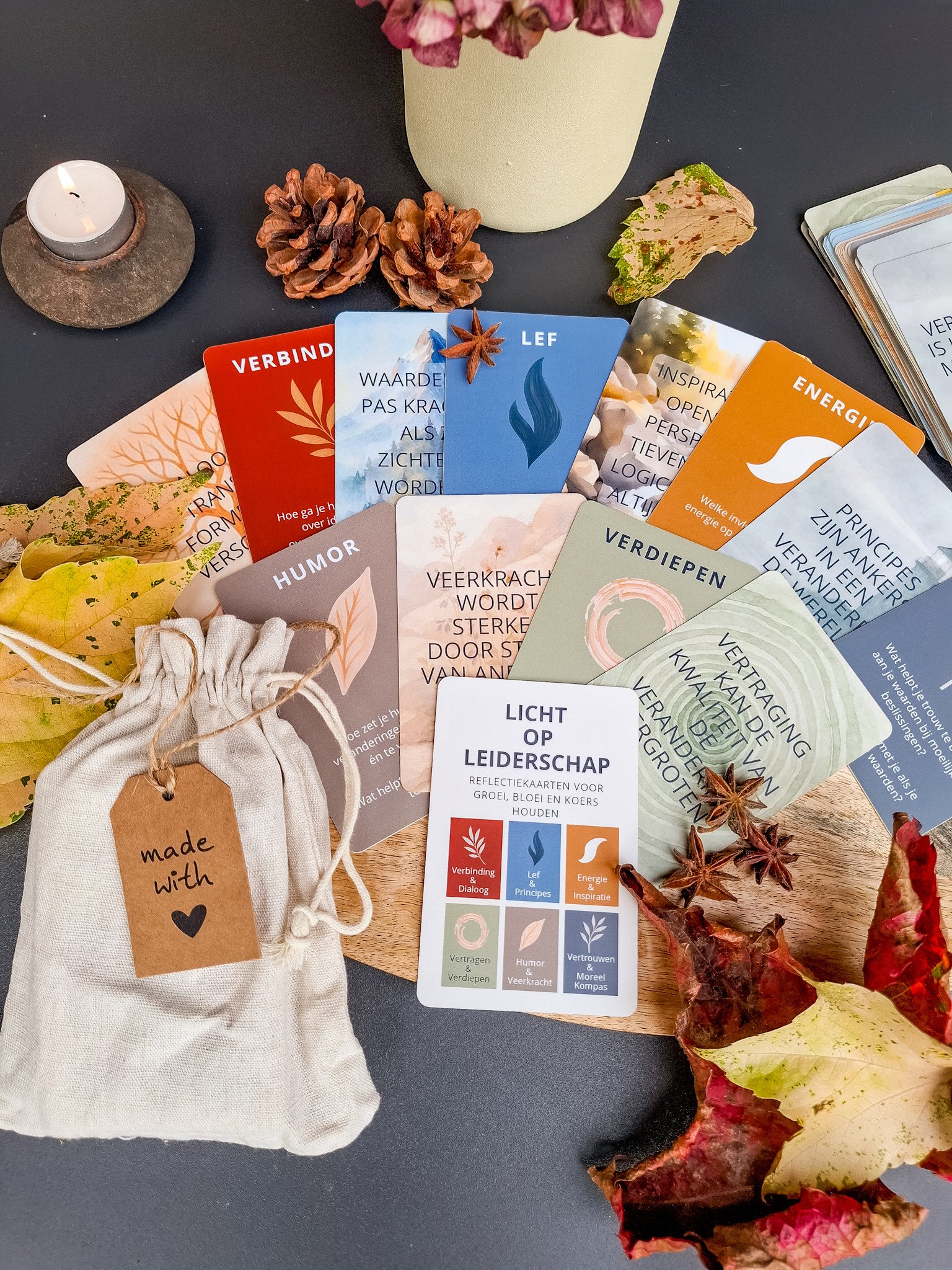Je ontvangt 52 kaarten, het luxe linnen bewaaretui, de vernieuwde mini-gids “Je team beweegt niet? Begin bij jezelf – van reflectie naar actie in leiderschap”